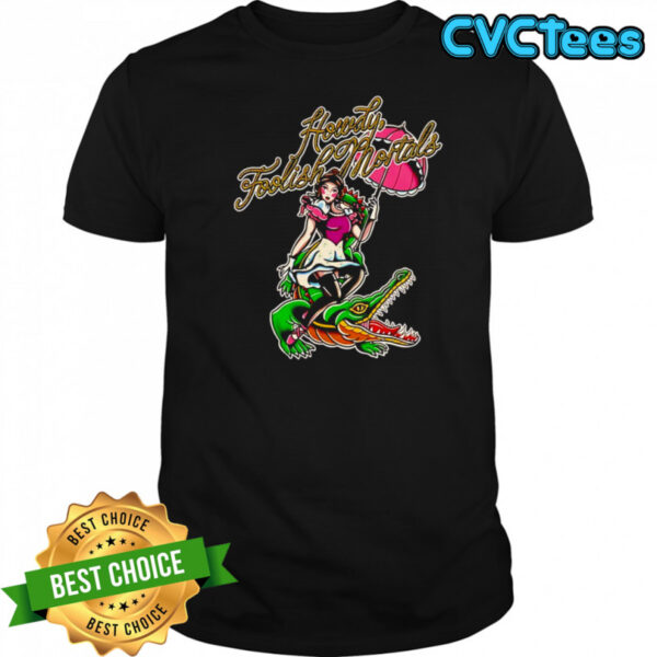Beautiful girl riding crocodile Howdy Foolish Mortals shirt, hoodie, sweater, longsleeve and ladies t-shirt