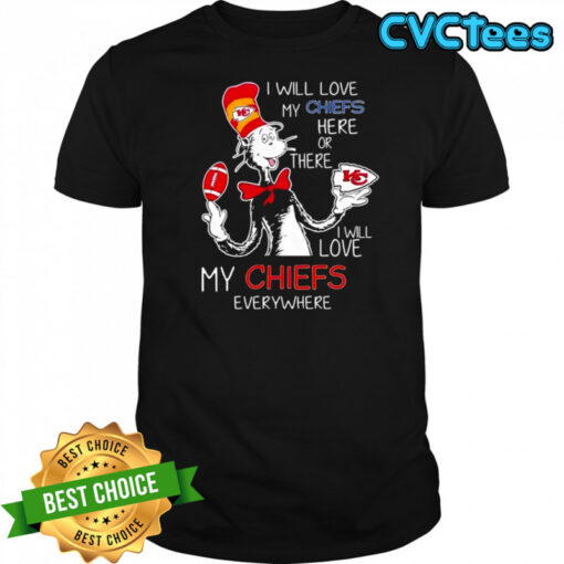 Cat in the Hat Kansas City Chiefs I will love my chiefs here or there I will love my Chiefs shirt, hoodie, sweater, longsleeve and ladies t-shirt