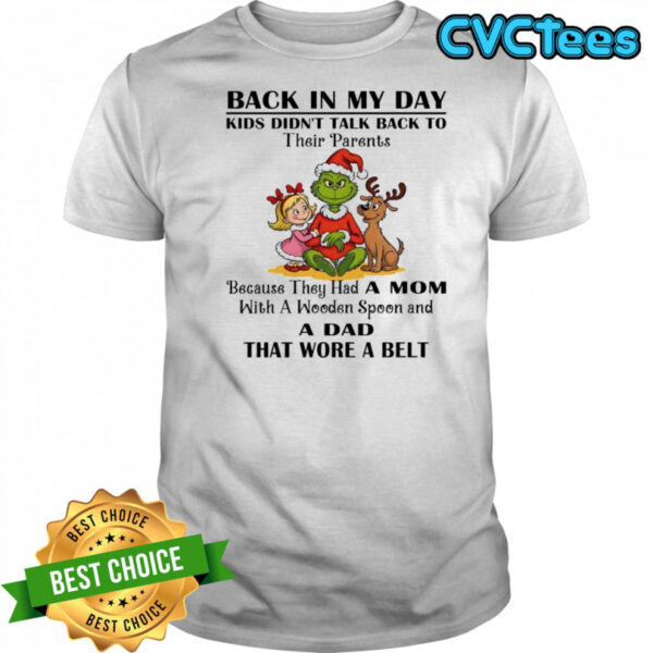 Embrace the nostalgia and make a statement with the Grinch and friends Back in my day kids didn’t talk back to their parents shirt today! Show the world that you appreciate the values of yesteryears and celebrate the timeless virtues of respect and politeness. Whether you wear it for a casual day out or a family gathering, this shirt is bound to turn heads and evoke fond memories. Join us in spreading the message of kindness and consideration. Get your hands on this unique piece and be part of a community that cherishes the essence of respect. Order now and wear your values proudly!