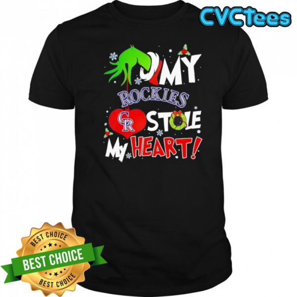 Grinch hand my Colorado rockies stole my heart Christmas shirt, hoodie, sweater, longsleeve and ladies t-shirt